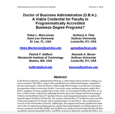 Doctor of Business Administration (D.B.A.): A Viable Credential for Faculty in Programmatically Accredited Business Degree Programs (2016). International Journal of Doctoral Studies.